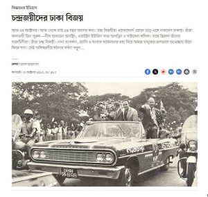 “আজ ২৭ অক্টোবর। আজ থেকে প্রায় ৫৪ বছর আগের কথা। চন্দ্র বিজয়ীরা এয়ারফোর্স ওয়ানে চড়ে এসে নামলেন ঢাকায়। তাঁরা কালজয়ী তিন পুরুষ—নীল অলডেন আর্মস্ট্রং, এডউইন ইউজিন বাজ অলড্রিন ও মাইকেল কলিন্স। সঙ্গে ছিলেন তাঁদের সহধর্মিণীরা। তাঁরা চন্দ্র বিজয়ী। নানা সংবর্ধনা, র্যালি ও সংবাদ সম্মেলনের মধ্য দিয়ে অজস্র মানুষের প্রাণঢালা শুভেচ্ছায় তাঁরা ফিরে যান। সেই অবিস্মরণীয় ঘটনার বর্ণনা পড়ুন…”