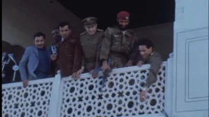 ছবি:শালিমার গার্ডেনসের ব্যালকনিতে মুয়াম্মার গাদ্দাফি (সর্ব ডানে)। এই ব্যালকনিতেই শেখ মুজিব ও জুলফিকার আলী ভুট্টোর হাত তুলে ধরেন মি. গাদ্দাফি।