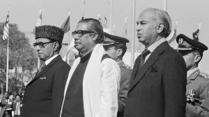 ছবি:লাহোর বিমানবন্দরে ১৯৭৪ সালে শেখ মুজিবকে অভ্যর্থনা জানান পাকিস্তানের প্রধানমন্ত্রী জুলফিকার আলী ভুট্টো ও প্রেসিডেন্ট ফজল ইলাহি চৌধুরী